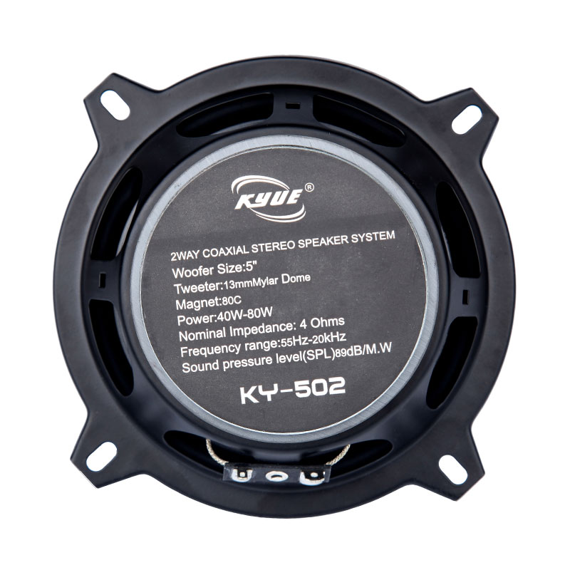Model:KY-502 (5.5) 2way Speaker System Power:40-80w Tweeter :13mmMylar Dome Voice Coil:25.5mm Nominal Impedance Ohms :4 Magnet:10z Frequency Range:55Hz-20KHz Sensitivity:89db Material(cone):PP from Taiwan