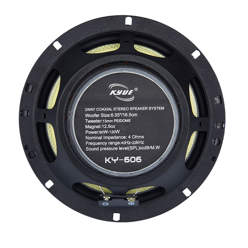 Model:KY-606 (6.5) 2way Speaker System Power:60-120w Tweeter :13mm PEI DOME Voice Coil:25.5mm Nominal Impedance Ohms :4 Magnet:12.5oz Frequency Range:40Hz-22KHz Sensitivity:92db Material(cone):Kevlar from Japan